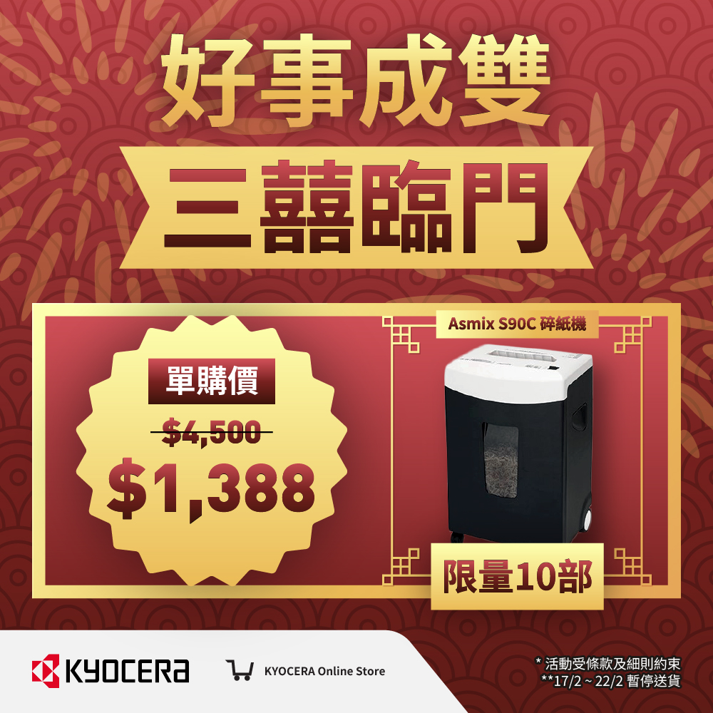 農曆新年期間,京瓷網上商店於 2026 年 2 月 16 日 至 2026 年 2 月 22 日的訂單,將於 2026 年 2 月 23 日陸續發貨。不便之處,敬請原諒。